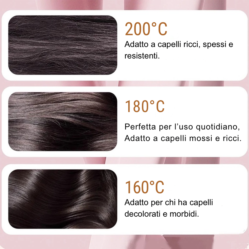 Tre temperature = scelta intelligente. 160°C per ritocchi rapidi, 180°C per sistemare bene, 200°C quando devo lisciare sul serio.